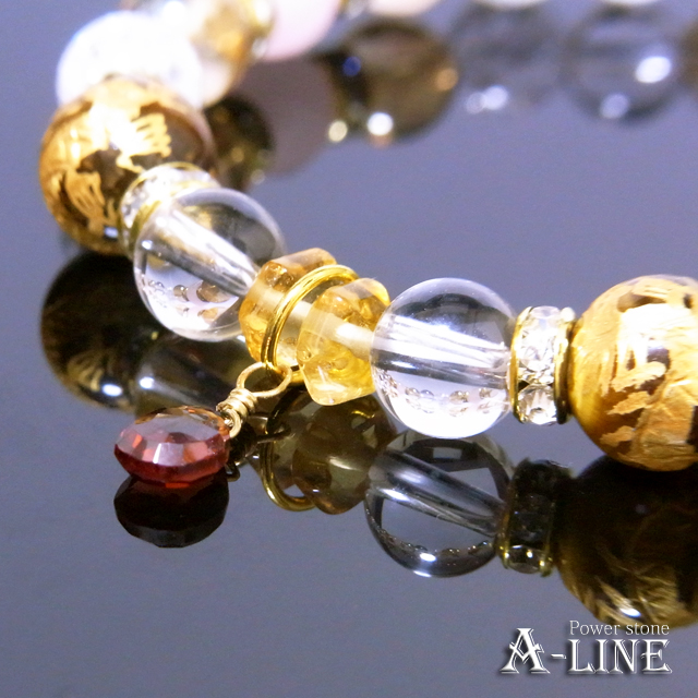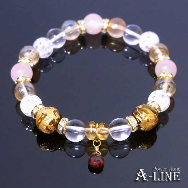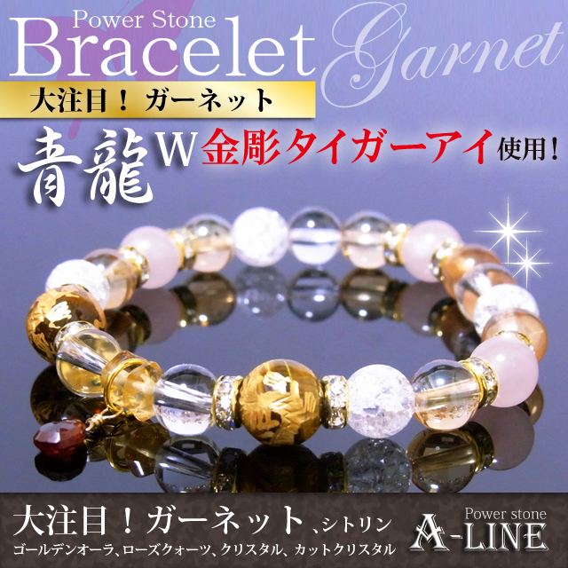 ガーネット(ワイヤー)・青龍金彫りタイガーアイ10mm・ゴールデンオーラ&ローズクォーツ&水晶&クラッククリスタル8mm・カットシトリン・合金ロンデル・国産高級オペロンゴム