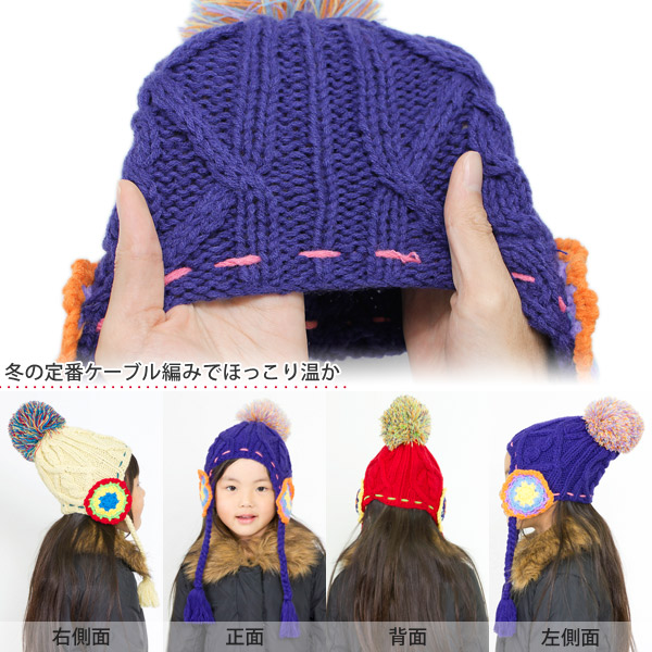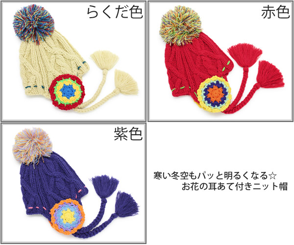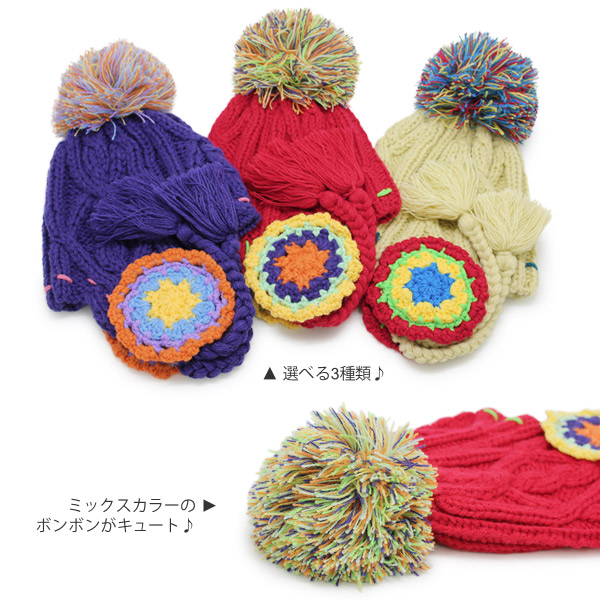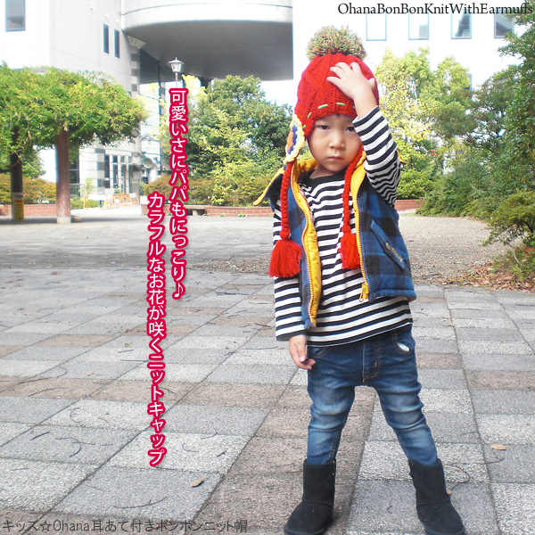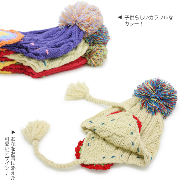 色使いが可愛すぎる冬の人気アイテム、耳あて付きのボンボンニット帽です。 小さいながらきちんとお洒落を意識している女の子☆中でも絶大な人気を集めているのがお花☆カラフルなお花モチーフを耳あて部分にのせ、極めつけにミックスカラーの揺れるボンボンをON♪キュートさが更に増しちゃう、パパも嬉しい防寒アイテムです。