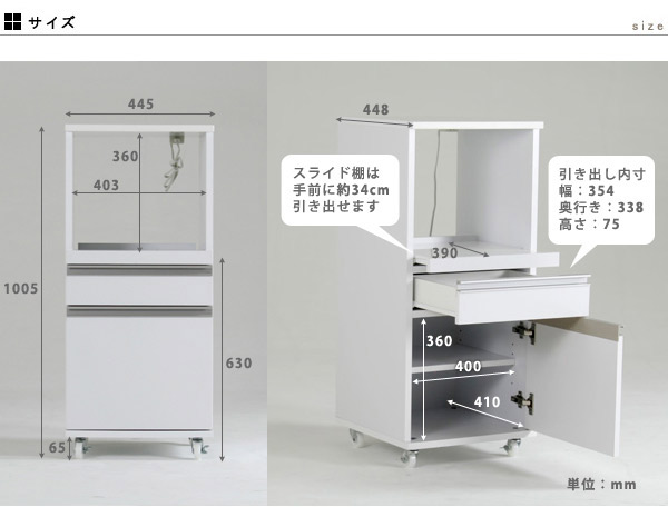 耐荷重:天板50kg/スライド棚15kg/引出し3kg/棚板5kg