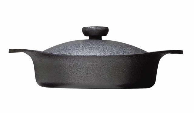 鉄製のフタ付きで、肉はもちろん野菜などの蒸し焼き料理にも最適です。スタイリッシュなフォルムなので、熱々のまま出来立てを食卓にそのまま出すことができます。鉄ハンドル付きなので、熱くなったフタも簡単に取ることができます。