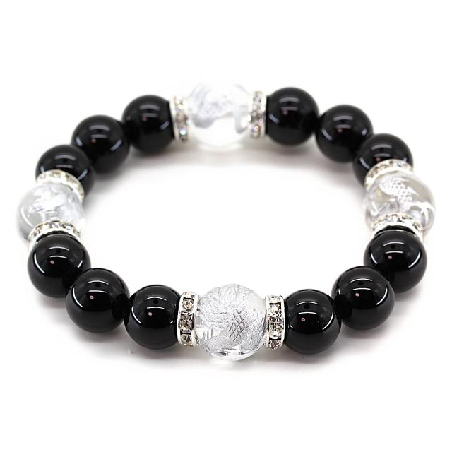 石輝 天然石オニキス12mm銀彫り五本爪皇帝龍水晶14mmパワーストーン数珠ブレスレット オリジナル巾着袋付き