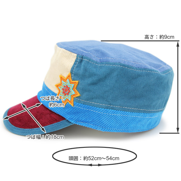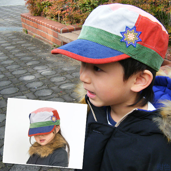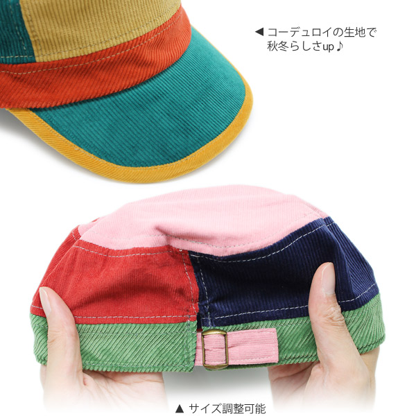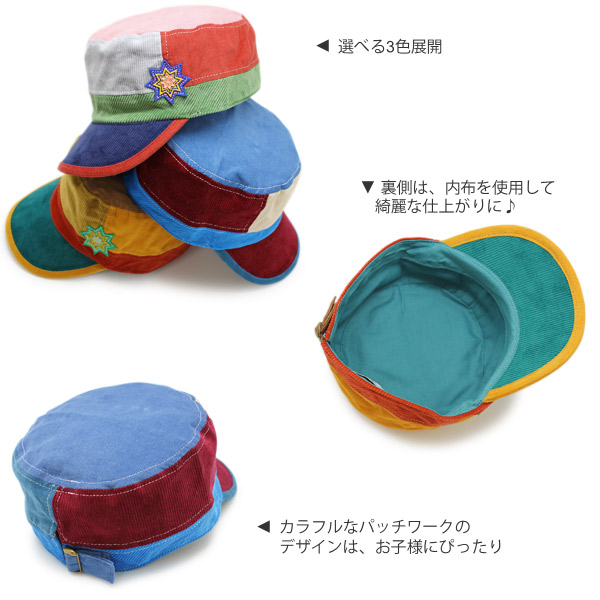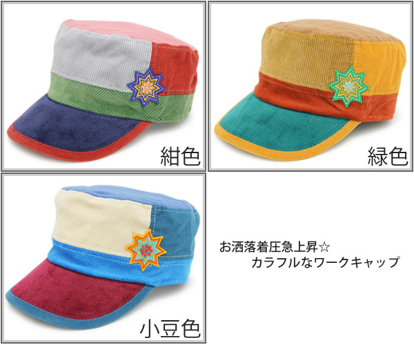 秋カラフルなコーデュロイ生地の切り替えがとってもお洒落なキャップ。つば、おでこ、てっぺんなど、複数のパッチワークがインパクトのあるデザイン♪八角星のワッペンもどこかエスニックな雰囲気でカッコイイですね。 後部のベルトでより頭にフィットした状態で着用できますよ!