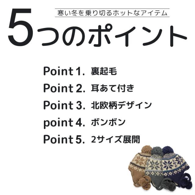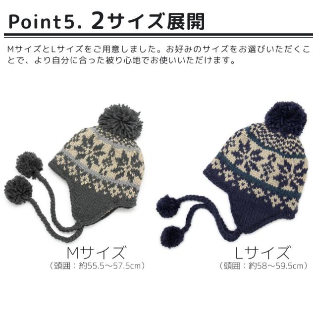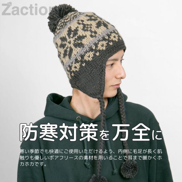 冬になると絶対的な主役アイテムとして人気の耳当て付きニット帽がZactionオリジナルで完成しました。帽子内側の毛足が長いボアフリース素材が、頭から耳までを優しく包み込み、まるで毛布に包まれているような暖かさと保湿力で寒い冬も快適に過ごせます。太めの毛糸を使用した温かみのある配色で、雪の結晶がぐるりと一周した北欧風のデザインです。大きすぎないボンボンが、程よいアクセントとなり男女問わずユニセックスでお使いいただけます。MサイズとLサイズの2サイズ展開なので、お好みのフィット感で着用できます。普段使いや、スキー・スノボなどのウィンタースポーツにも是非ご利用ください。※灰色のみ、裏地が毛足のより長いフリース素材に変更となりました。