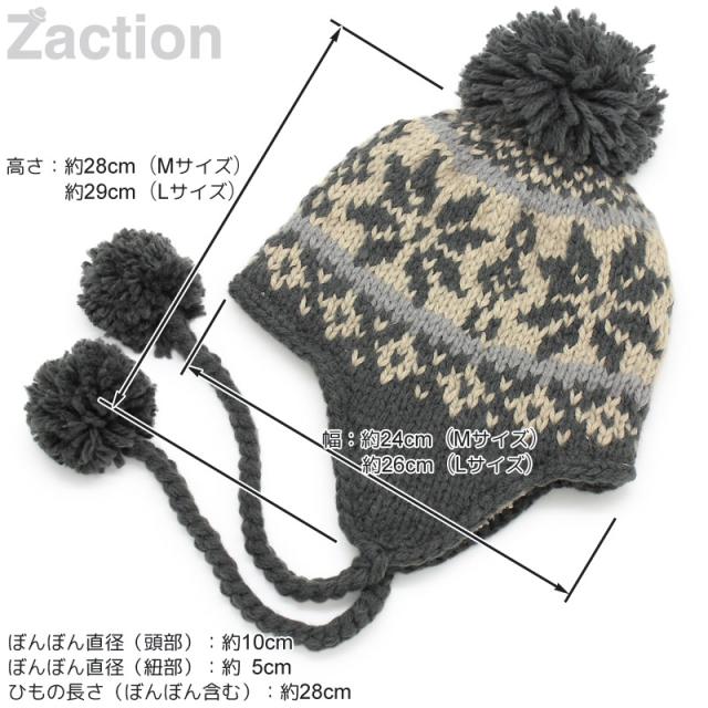 Mサイズ:サイズ表記55.5〜57.5cm(頭囲:約55.5〜57.5cm、幅:約24cm、高さ:約28cm[※耳あての端からボンボンは含まず]、紐の長さ(ボンボン含む):約28cm、ボンボン直径(頭部):約10cm、ボンボン直径(紐部):約5cm)