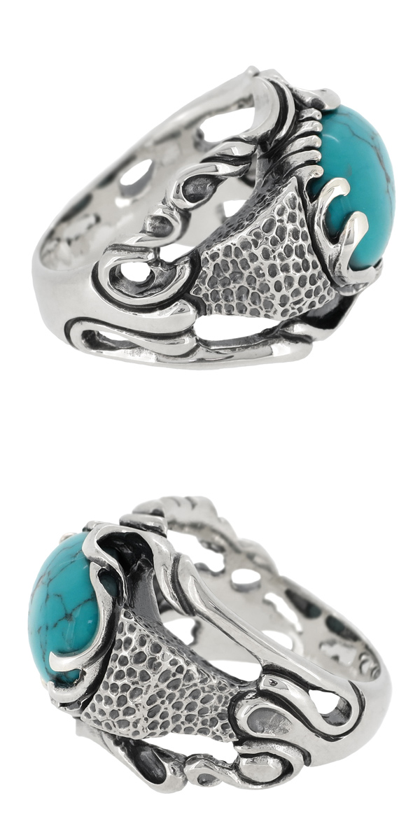 大ぶりなターコイズを横向きにセットした大胆なリング。