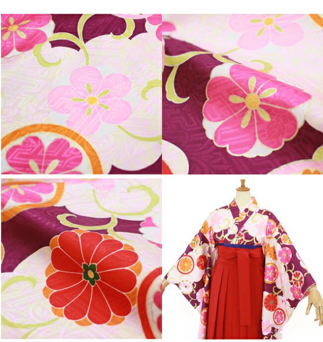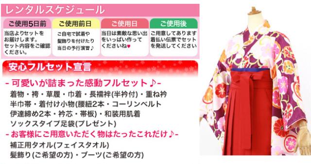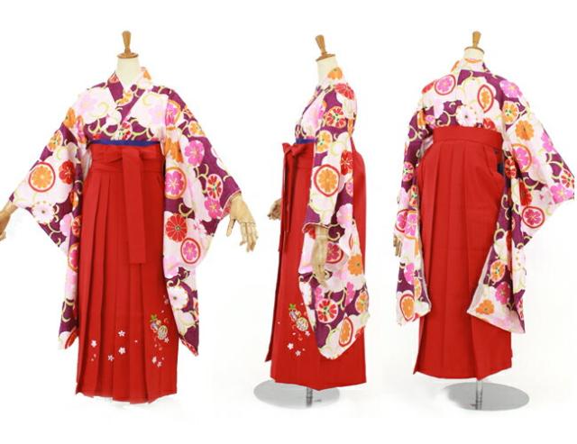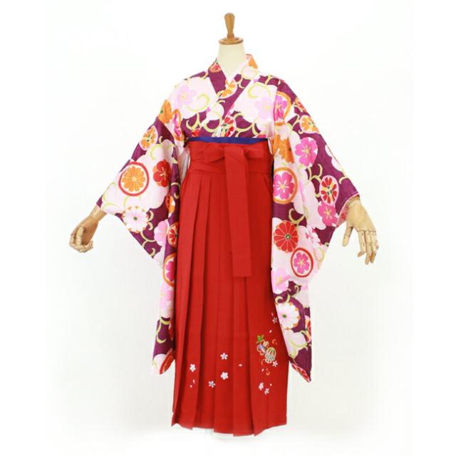 【7泊8日レンタル】卒業式 袴 レンタル 女 小学校卒業「紫地に花 紋 袴:赤 レッド」ジュニア卒業式袴セット2尺袖着物&袴 フルセットレンタル 安い