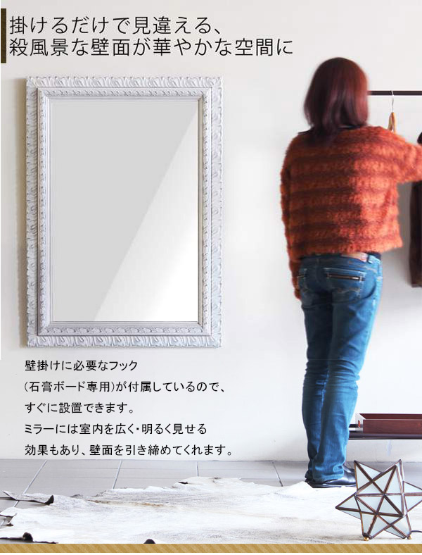 鏡 壁掛け おしゃれ アンティーク ミラー ホワイト 壁掛けミラー ウォールミラー 玄関 幅80cm 高さ110cm F-001WM6090 ◎
