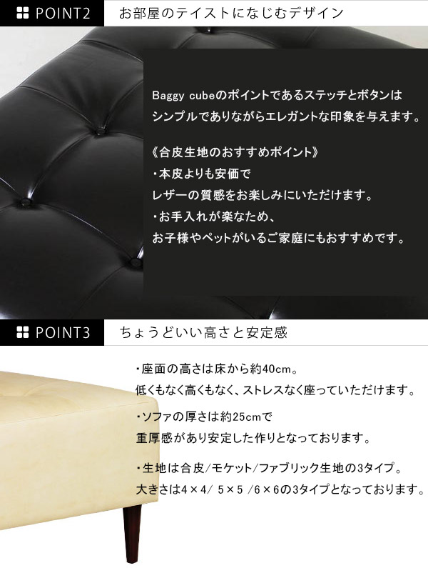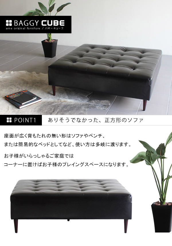 ベンチソファ 背もたれなし レザー ベンチソファー 二人掛け 三人掛け 日本製 正方形 Baggy Cube 5×5 合皮 □