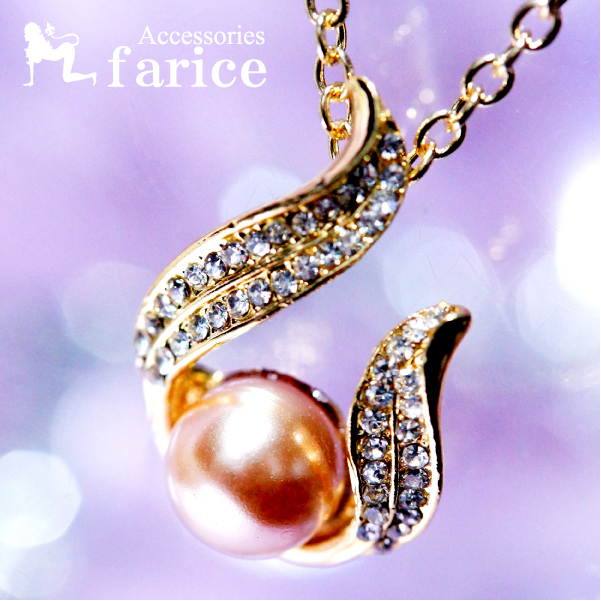 一粒ゴールドコーティングパール(真珠)装飾 2ラインストーン カールフレーム ゴールドカラー レディース ペンダント ネックレス