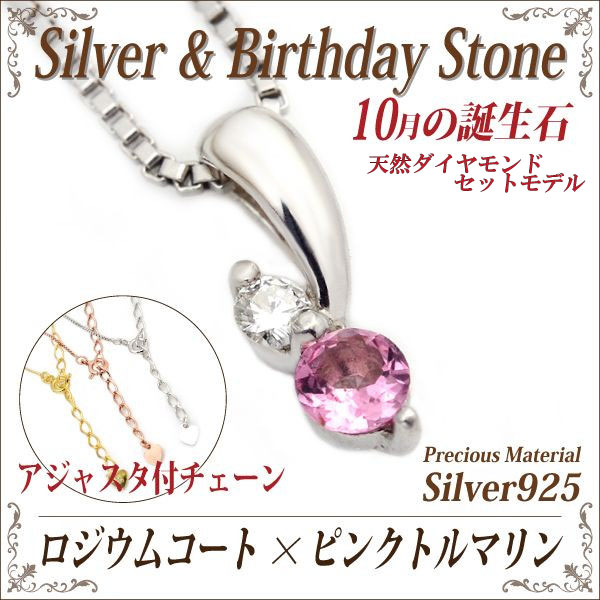 ピンクトルマリン ネックレス 送料無料 シルバー925 誕生石 ペンダント 脇石ダイヤモンド ツインストーン チェーン 付 ロジウムモデル