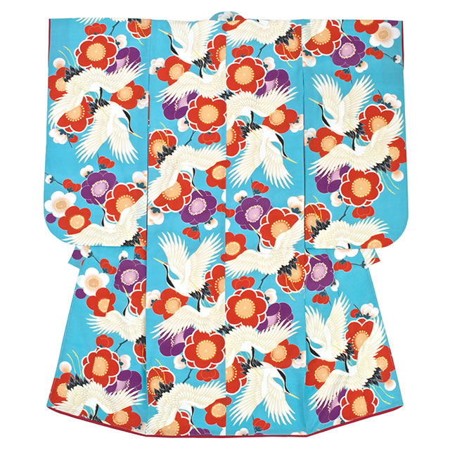 振袖の長着は、ほころぶ梅の花に鶴がデザインです。