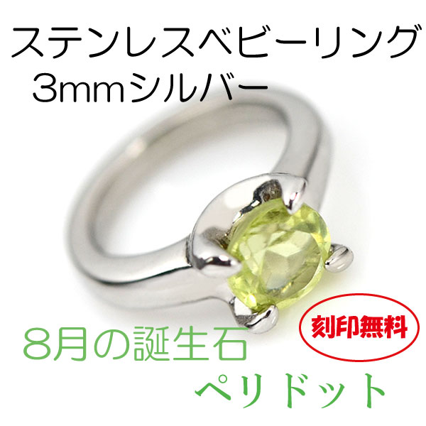 送料無料 刻印無料 サージカルステンレス製 ベビーリング 8月ペリドット 3mm シルバーモデル