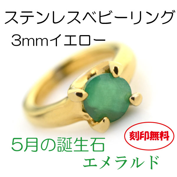 ベビーリング エメラルド 送料無料 刻印無料 ステンレス 5月 3mm イエローモデル サージカルステンレス