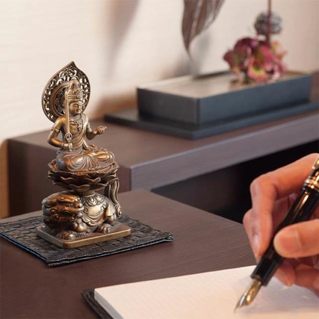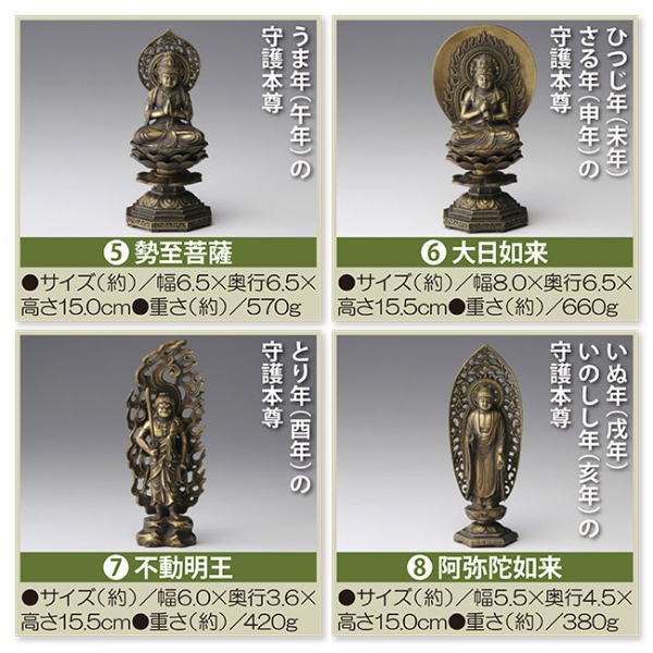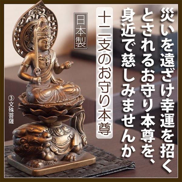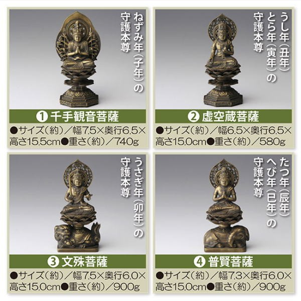 すべての人は「生まれ年の干支」によって、それぞれの「お守り本尊」が定められていると言われています。 自らのお守り本尊の存在を知り、慈しむことにより、様々な災いから免れ、幸運へと導ていてくれると言われています。そして何より、いつも身近にお守り本尊をおくことが心の支えとなることでしょう。インテリアにマッチする古美金仕上げのこちらの本尊は、どれも高岡の工房に相伝する技法で職人が一点一点着色しております。【商品名】十二支のお守り本尊【タイプ】1.千手観音菩薩 ねずみ年(子年)の守護本尊 2.虚空蔵菩薩 うし年(丑年)・とら年(寅年)の守護本尊 3.文殊菩薩 うさぎ年(卯年)の守護本尊 4.普賢菩薩 たつ年(辰年)・へび年(巳年)の守護本尊 5.勢至菩薩 うま年(午年)の守護本尊 6.大日如来 ひつじ年(未年)・さる年(申年)の守護本尊 7.不動明王 とり年(酉年)の守護本尊 8.阿弥陀如来 いぬ年(戌年)・いのしし年(亥年)の守護本尊【素材】亜鉛合金(古美金仕上げ)【生産国】日本