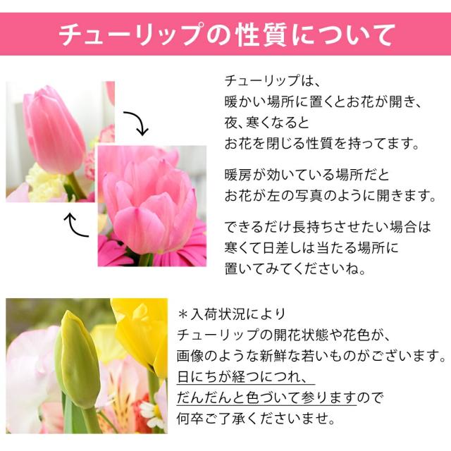 | 内容 | チューリップ/スイートピー/ガーベラ/スプレーカーネーション/カーネーション/ 季節のお花・グリーン/バスケット(デザインはおまかせ)/ ご希望の方にメッセージカード/お取扱い説明書/品質保証付リーフレット ※花材・資材は入荷状況により変更になる場合がございます。 |