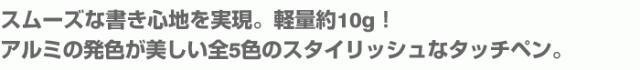 | ペン先が柔らかい導電性繊維で操作がスムーズに。 使いやすくカラフルな全5色のスタイラスペン。 メタリックなアルミボディが美しいHameeオリジナルタッチペンは スマホやタブレットでのインターネット閲覧やアプリゲームをする時などに便利です。 後部にはクリップが付いているので、シャツの胸ポケットやダイアリーケースなどにも 挟みやすくなっています。 お求めやすい価格なので、タッチペンを使うのが初めていう方でもお気軽にお試しいただけます。 スマートアルミスタイラスペンで、あなたのスマホライフをワンランク上のものに。 |
