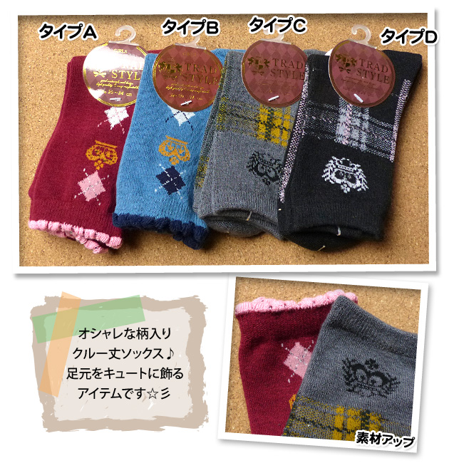 子供 靴下 ソックス クルー丈 女の子 王冠柄 アーガイル チェック 女児 キッズ ジュニア 15-19cm 20-24cm【メール便OK】