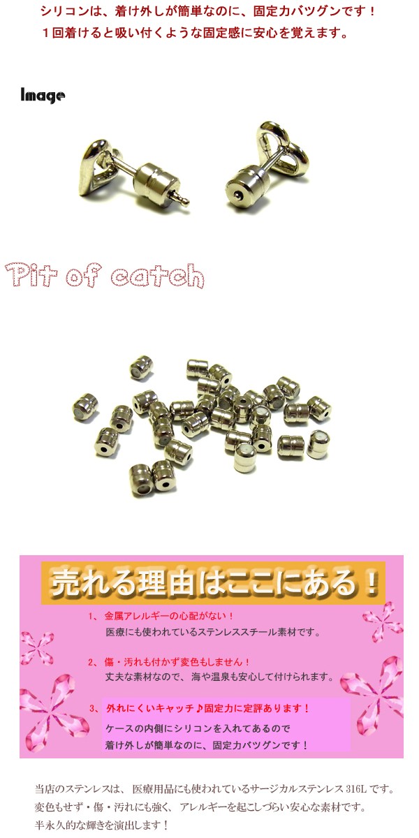 しっかりと留めてくれる!ステンレススチール316L素材でアレルギーの心配無し!外側ステンレスの中にはシリコンをぎっしり詰め込み、しっかりとピアスポストを掴み、固定する仕組みになっています。シリコンは、着け外しが簡単なのに、固定力バツグンです!1回着けると吸い付くような固定感に安心を覚えます。