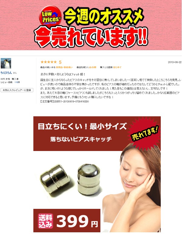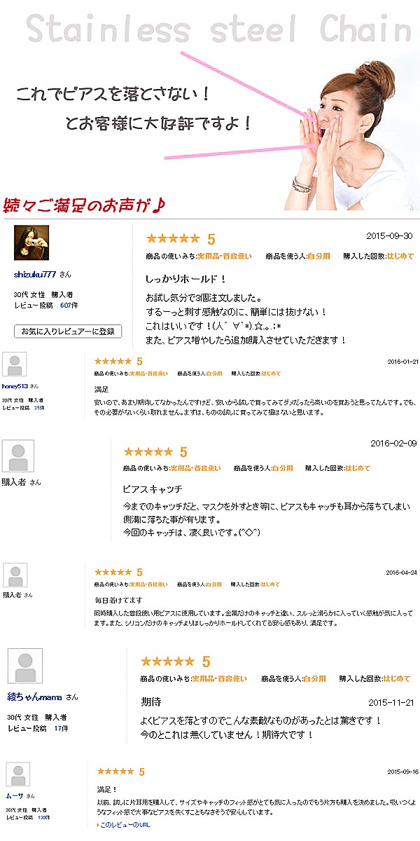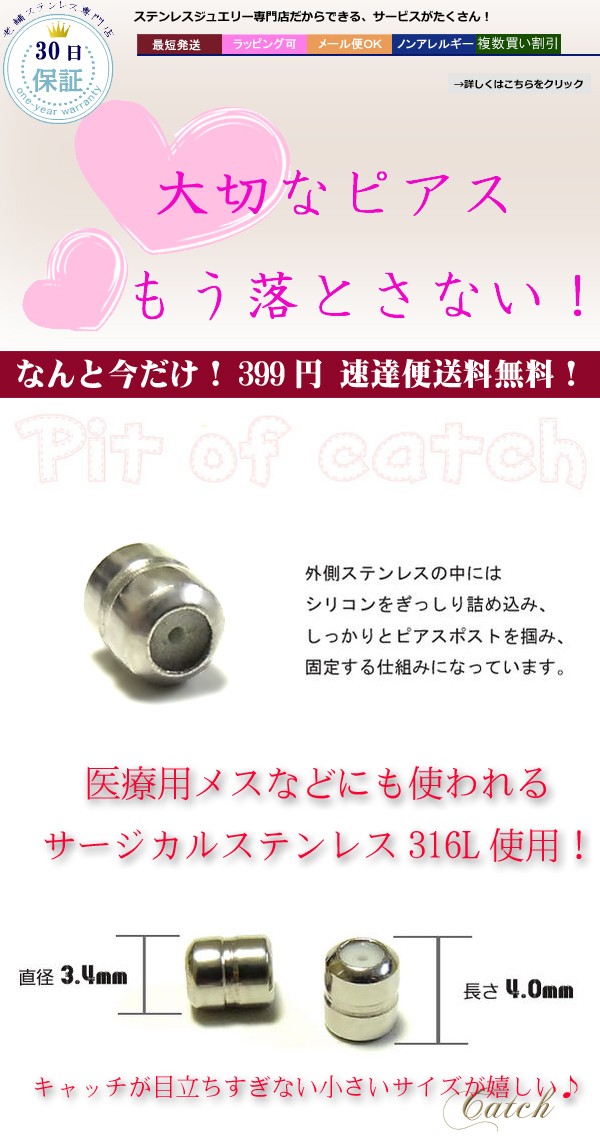 - ピアスのキャッチをなくしてしまい、困っていました。このキャッチはしっかりとまってくれて、ステンレスなのが安心です。