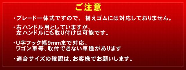- U字フックと書いてあるのに、対応していない。通常、装着時はカチッと音がしてアームと勘合するが、この品物はしない。装着後ワイパー動作したら、外れてすっ飛んで行った。詐欺じゃないのか?