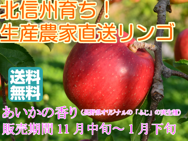 「あいかの香り」の収穫時期は11月上旬〜11月中旬です。販売期間は11月上旬から、おおよそ1月〜3月位までの貯蔵販売致します。蜜の入ったものも年明け1月〜2月位にかけて徐々に果肉の糖分に変化して見えなくなっていきますが、その分甘味は増します。また、果肉の硬さは春先に向けて徐々に軟らかくなっていき、収穫時の硬さには及びません。保存できるりんご品種ですが収穫時からの時間経過とリンゴ自身の呼吸生成で品質は徐々に収穫時の食味には及ばなくなることをご了承下さいませ。