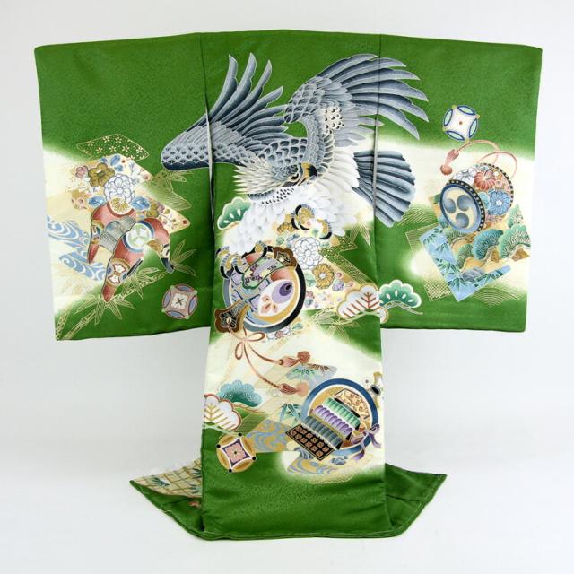【 お宮参り 産着 レンタル 】「緑地に鷹と小槌・籠手・矢・太鼓・蔵」 お宮参り レンタル 衣装 男児 祝着 初着 産着 レンタル衣装