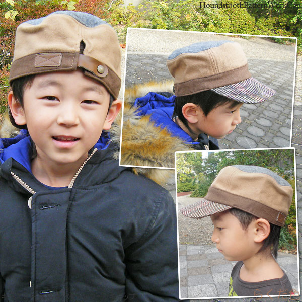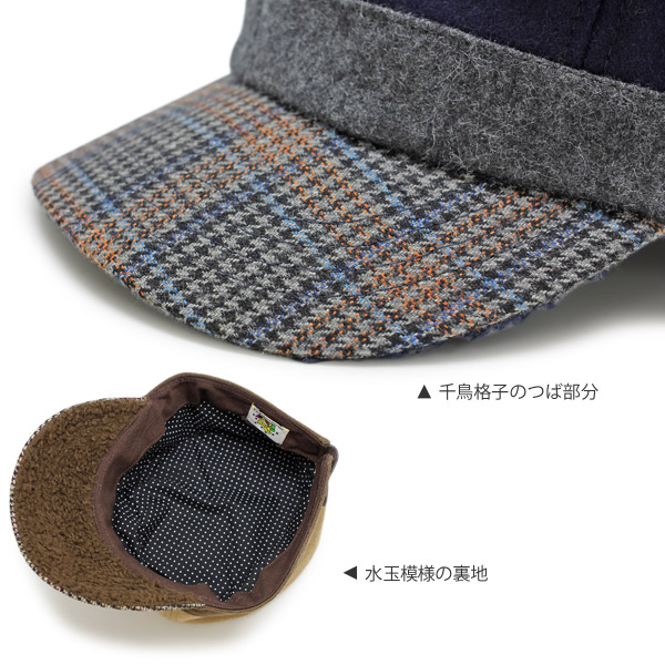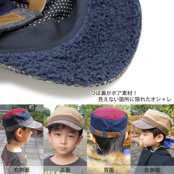 千鳥格子のつばがとってもモードでお洒落なキャップ。つば、頭囲、ボディ、天井と色が切り替えられたあたりは子供らしい仕様なのですが、天井部分はキルティングのようなカット、後部ベルト部分はレザー調と大人でも欲しくなっちゃうようなも洗練されたデザインはキッズ用とは思えないほど!見えない裏地はドット柄と可愛く、さらっとしていますが保温力はありますので真冬でも安心です。