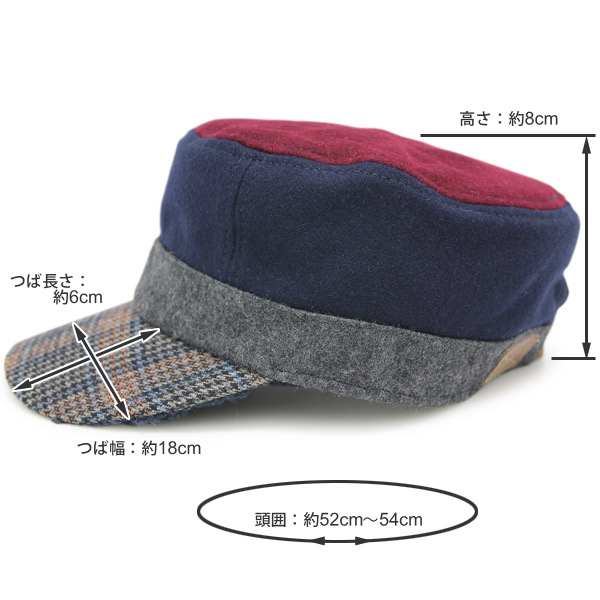 本体:ウール50% レーヨン50%、つば表:ポリエステル70% ウール30%、つば裏:ポリエステル100%