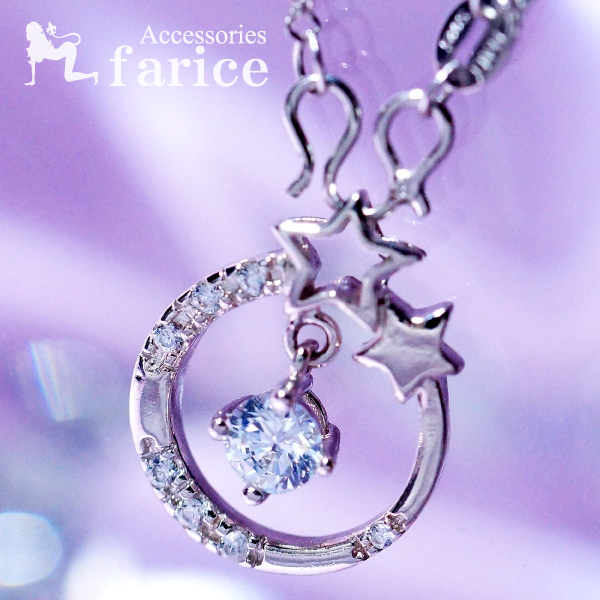 ムーン(月)&ツインスター(星) クリアキュービックジルコニア ドロップ&ラインストーン装飾 レディース ペンダント ネックレス