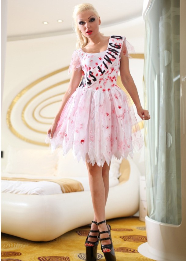 血みどろのゾンビ花嫁コスチューム!付属の血糊セットで純白のウェディングドレスに自由自在にアレンジ