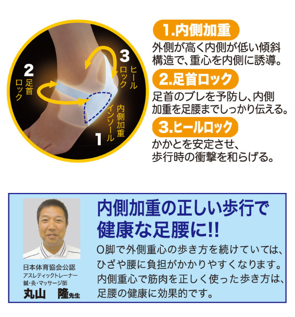 内側の筋肉を正しく使い、ひざや腰に負担の少ない歩き方へ導くO脚矯正用サポーターです。従来品のようにインソールタイプではないので、家の中でもO脚補整。底部の傾斜で重心を内側へ誘導。足首の3点を固定し、内側加重を足腰までしっかり伝えます。また、衝撃吸収のやわらかゲル素材を使用し、歩行が1日中ラクラクです。