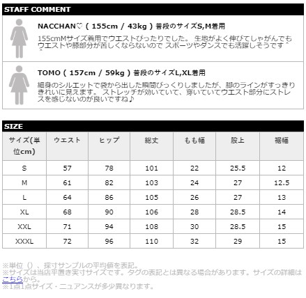 - 158cm 45kg程、Mサイズにしました。ウエストがゴム仕様で、全体的にストレッチが効いているので、丁度いい感じでした。長さも適度にクシュッとなってくれて、タイツのようなパツパツ感や、逆に長過ぎて裾...