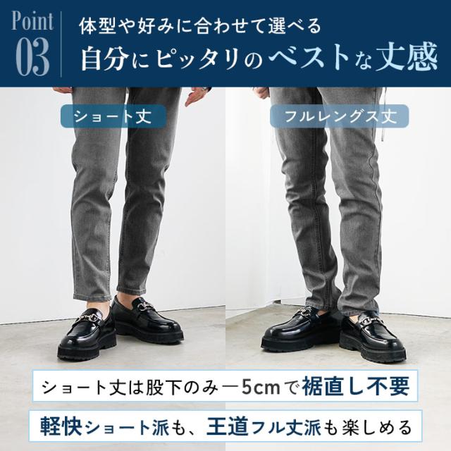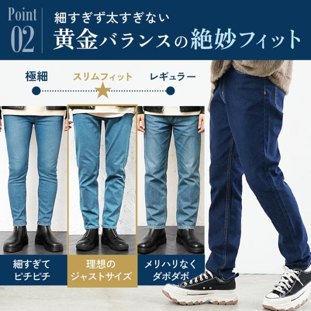 【スリムテーパードデニム】「ピチピチ」でも「ダボダボ」でもない絶妙なスリムフィットを実現しました。