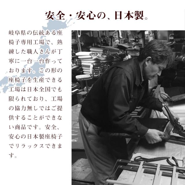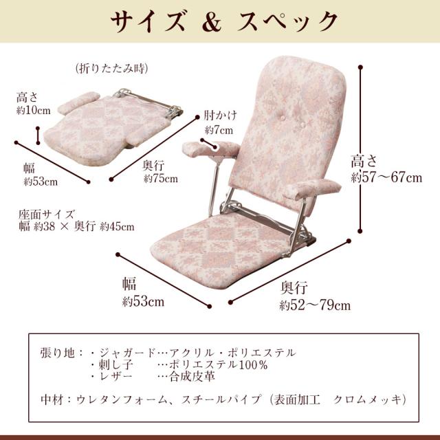 | サイズ | 全体:約幅53×奥行52〜79×高さ57〜67cm (※奥行・高さは、リクライニングの角度により異なります。) 座面:約幅38×奥行45×厚み5cm 折りたたみ時:約幅53×奥行75×高さ10cm |