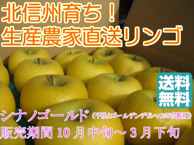「シナノゴールド」の収穫時期は10月中旬〜11月上旬です。販売期間は11月上旬から、おおよそ1月〜3月位までの貯蔵販売致します。果肉の硬さは春先に向けて徐々に軟らかくなっていき、収穫時の硬さには及びません。保存できるりんご品種ですが収穫時からの時間経過とリンゴ自身の呼吸生成で品質は徐々に収穫時の食味には及ばなくなることをご了承下さいませ。