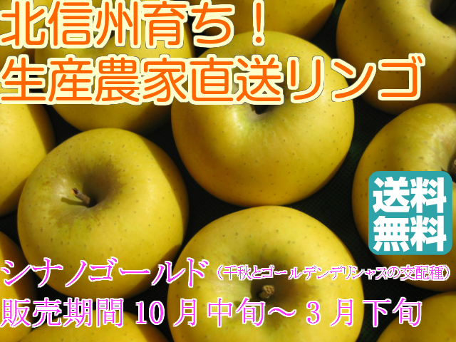 「シナノゴールド」の収穫時期は10月中旬〜11月上旬です。販売期間は11月上旬から、おおよそ1月〜3月位までの貯蔵販売致します。果肉の硬さは春先に向けて徐々に軟らかくなっていき、収穫時の硬さには及びません。保存できるりんご品種ですが収穫時からの時間経過とリンゴ自身の呼吸生成で品質は徐々に収穫時の食味には及ばなくなることをご了承下さいませ。