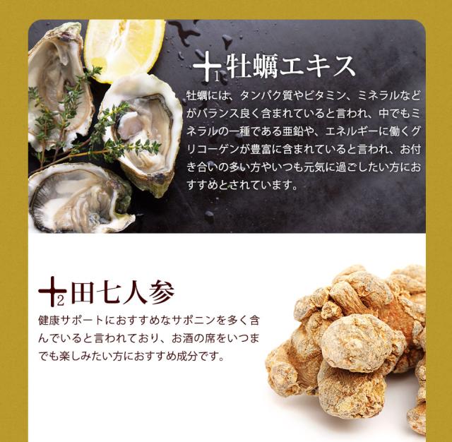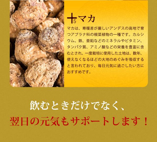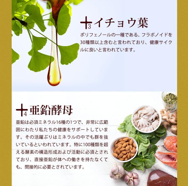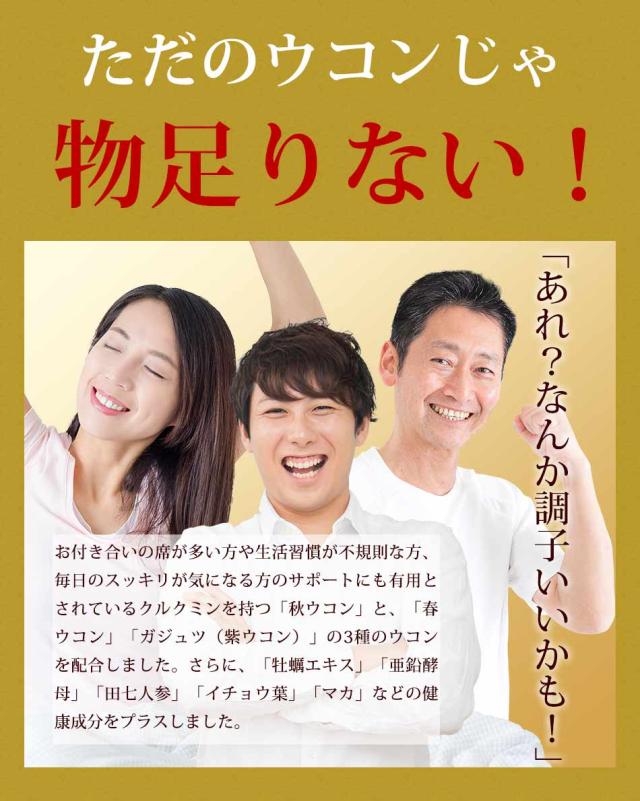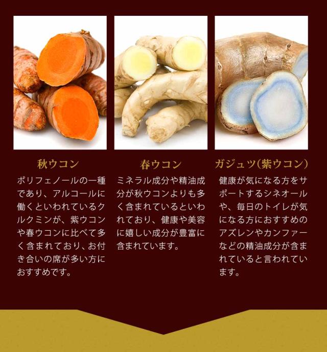 秋ウコン(国内製造)、春ウコン(国内製造)、ガジュツ(国内製造)、乳糖、亜鉛酵母、田七人参、マカ、牡蠣エキス末、イチョウ葉エキス末/結晶セルロース、ショ糖脂肪酸エステル、微粒二酸化ケイ素