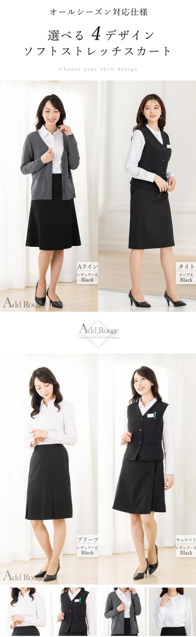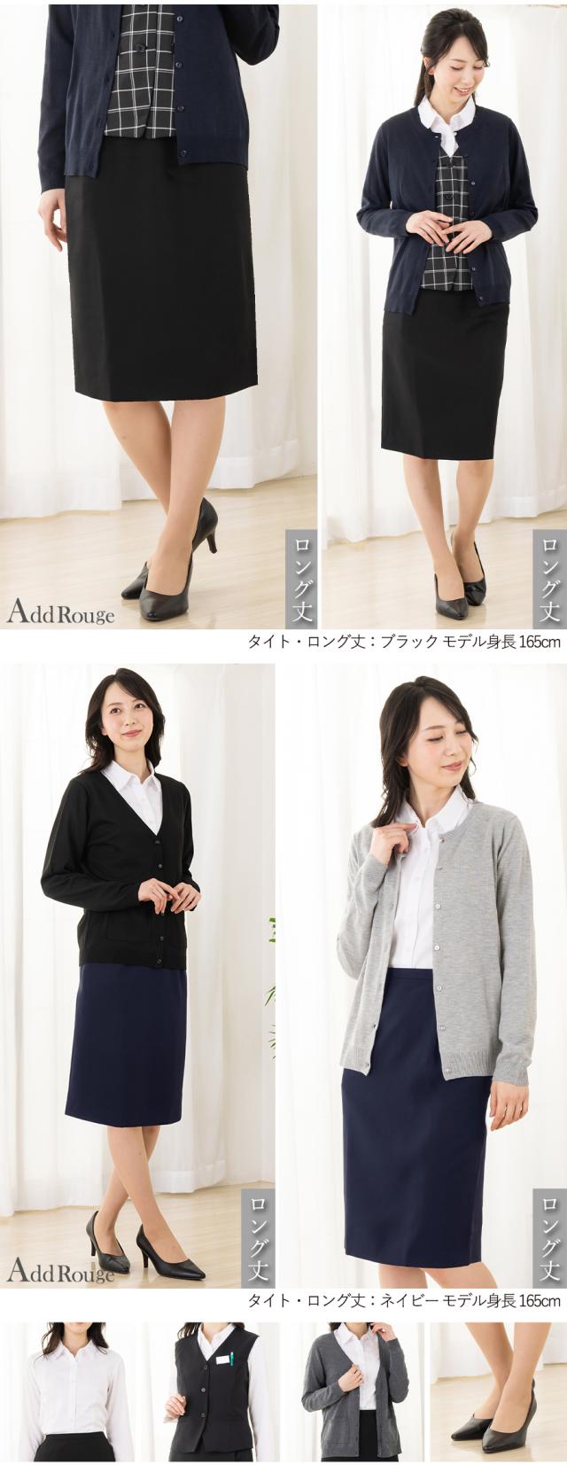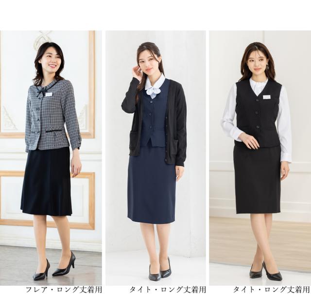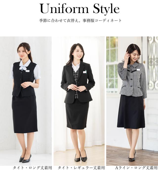 ベストやオーバーブラウスを合わせて、ベーシックな事務用品(事務服・企業制服)としてはもちろん、別売りのジャケットやシャツ・スーツインナーを合わせて、オフィスカジュアルとしてもきちんと感あるスタイルで着用いただけます。 |