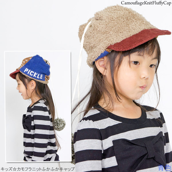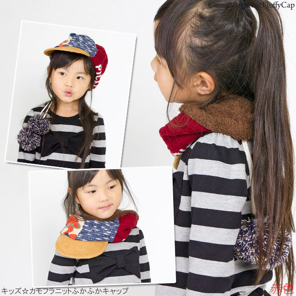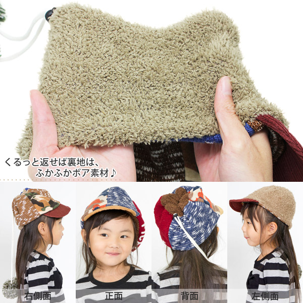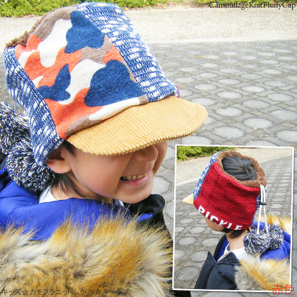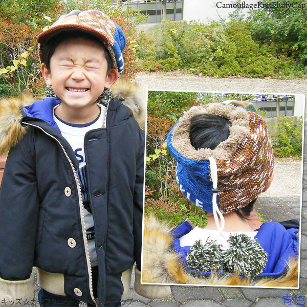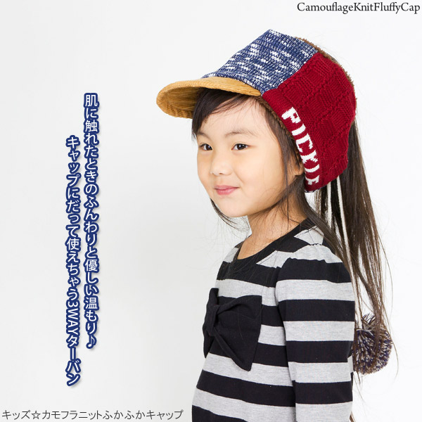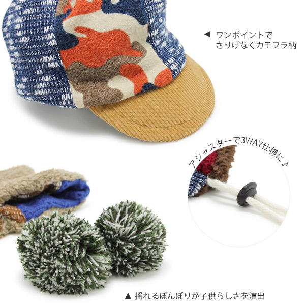 キッズ キャップ 帽子 子供用 3way ネックウォーマー ニット ターバン キャップ 秋冬 / キッズ カモフラニットふかふかキャップ