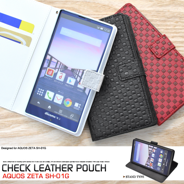 市松模様レザーデザインのAQUOS ZETA SH-01G/Disney Mobile SH-02G用スタンドケースポーチ。