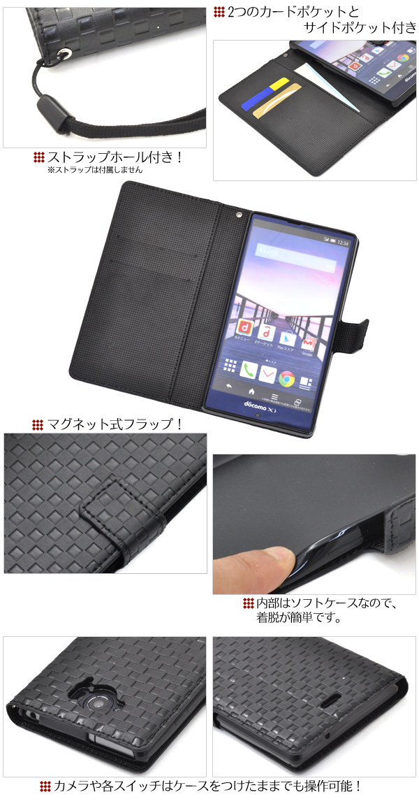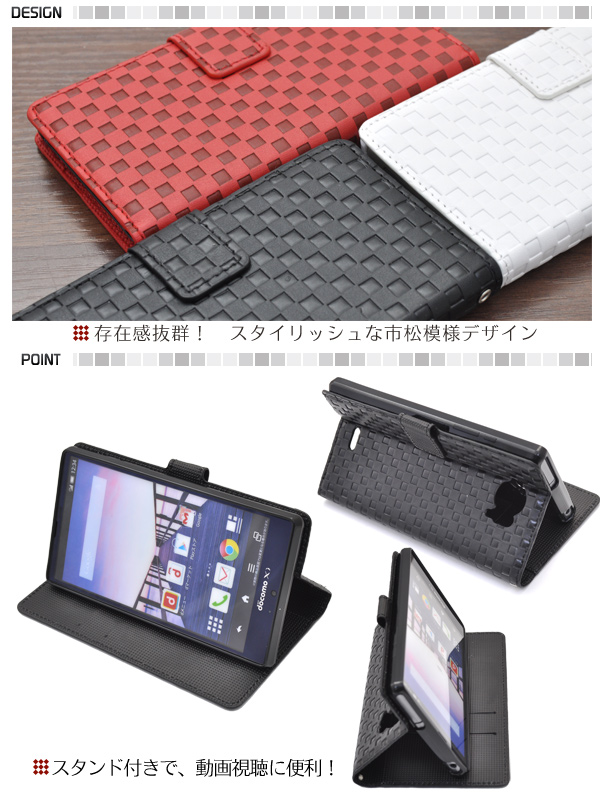 | 市松模様レザーデザインのAQUOS ZETA SH-01G/Disney Mobile SH-02G用スタンドケースポーチ。 衝撃やキズなどからAQUOS ZETA SH-01G/Disney Mobile SH-02Gを守ります。 また、内部はソフトケースなので着脱が簡単です。 背面を折り返すとスタンドとして使用できるので、動画視聴に便利です。 便利なストラップホール付きです。 横開きタイプなので、手帳のように使うことができます。 また、内側に2つのカードポケットとサイドポケットが付いています。 ※ AQUOS ZETA SH-01G/Disney Mobile SH-02Gは付属しません。 ※ライセンス商品ではありません ※カードは付属しません。 | ||||||||