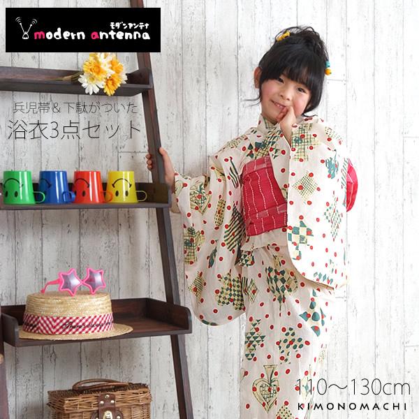 2015年新作のモダンアンテナのキッズ浴衣セットです。浴衣、浴衣帯、下駄の3点セットです。
