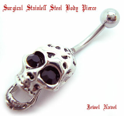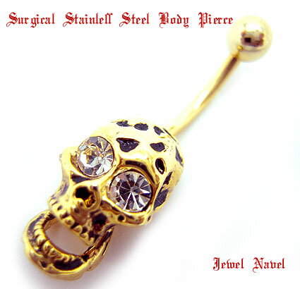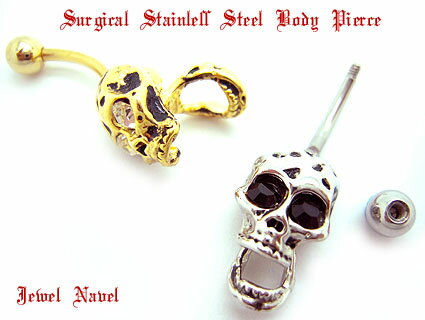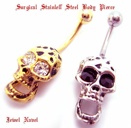 顎がカクカク動いてファンキーなスカルのヘソピです。先端の小さい方のボールがネジ式で取り外しができます。ヘソ以外にも耳に着けてもGOOD!