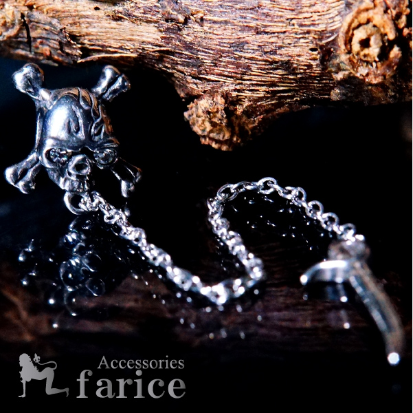 パイレーツスカル(海賊旗髑髏)&ソード(剣)&ロングチェーン クリアストーン装飾アイズ ステンレス316L 片耳ピアス