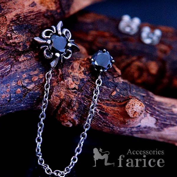 ブラックキュービックジルコニア2ポイント装飾 百合の爪石留め&ロングチェーン メンズ ステンレス316L 2ホール片耳ピアス