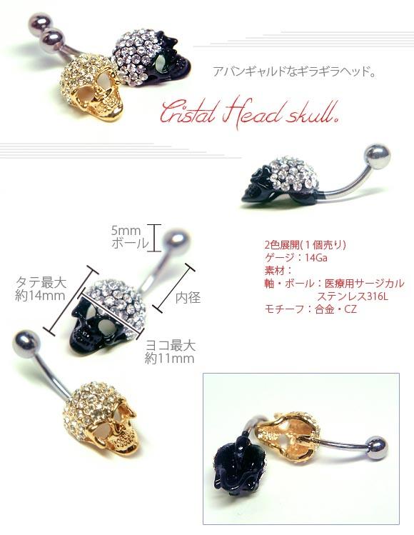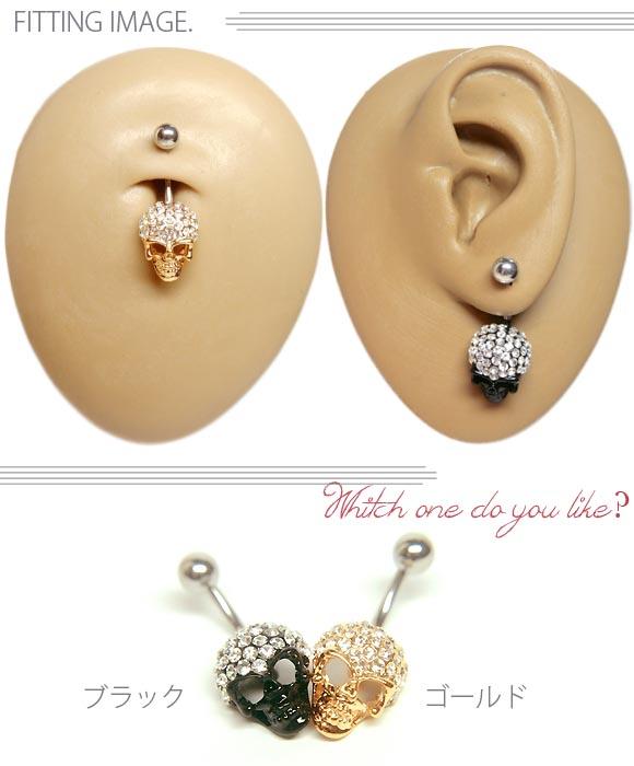 ブラックとゴールドのドクロにギラギラのラインストーンを施したアバンギャルドなデザインが目を引くへそピアスです。