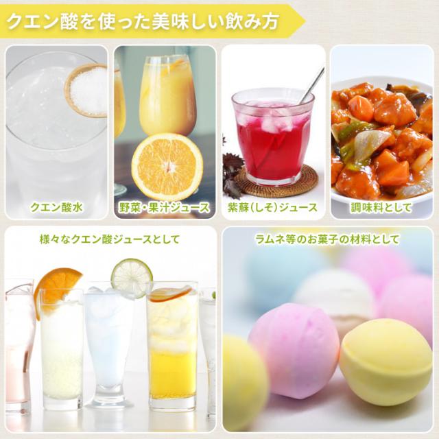 クエン酸は、お飲み物や美容、お掃除、食品加工等いろいろとご利用いただけます。安全面でもとても優れており、いろいろな用途として現在使用されております。