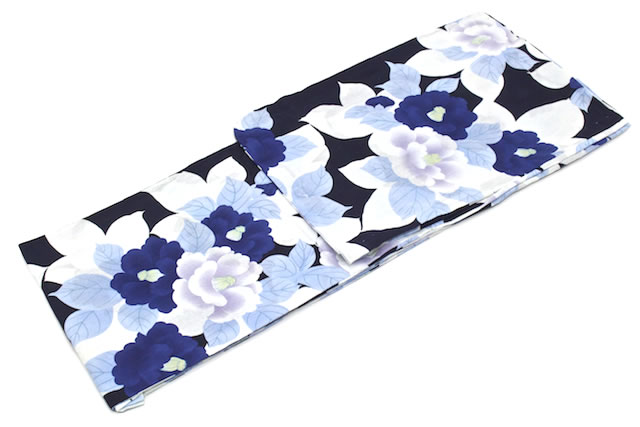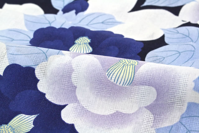落ち着いた紺地に椿の花が描かれています。