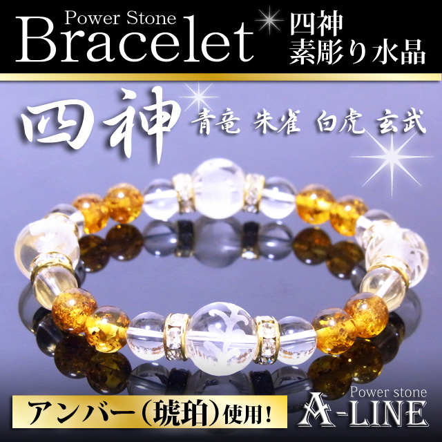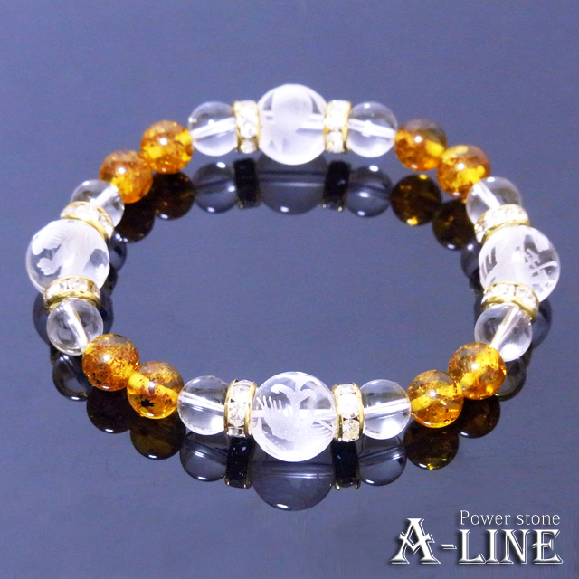 パワーストーン ブレスレット 金運UP 四神素彫り水晶12mm&アンバー(琥珀)&水晶8mm PW-2809