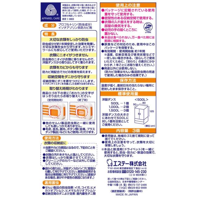 ●効果は約1年間持続するので、長期の衣類収納に最適です。